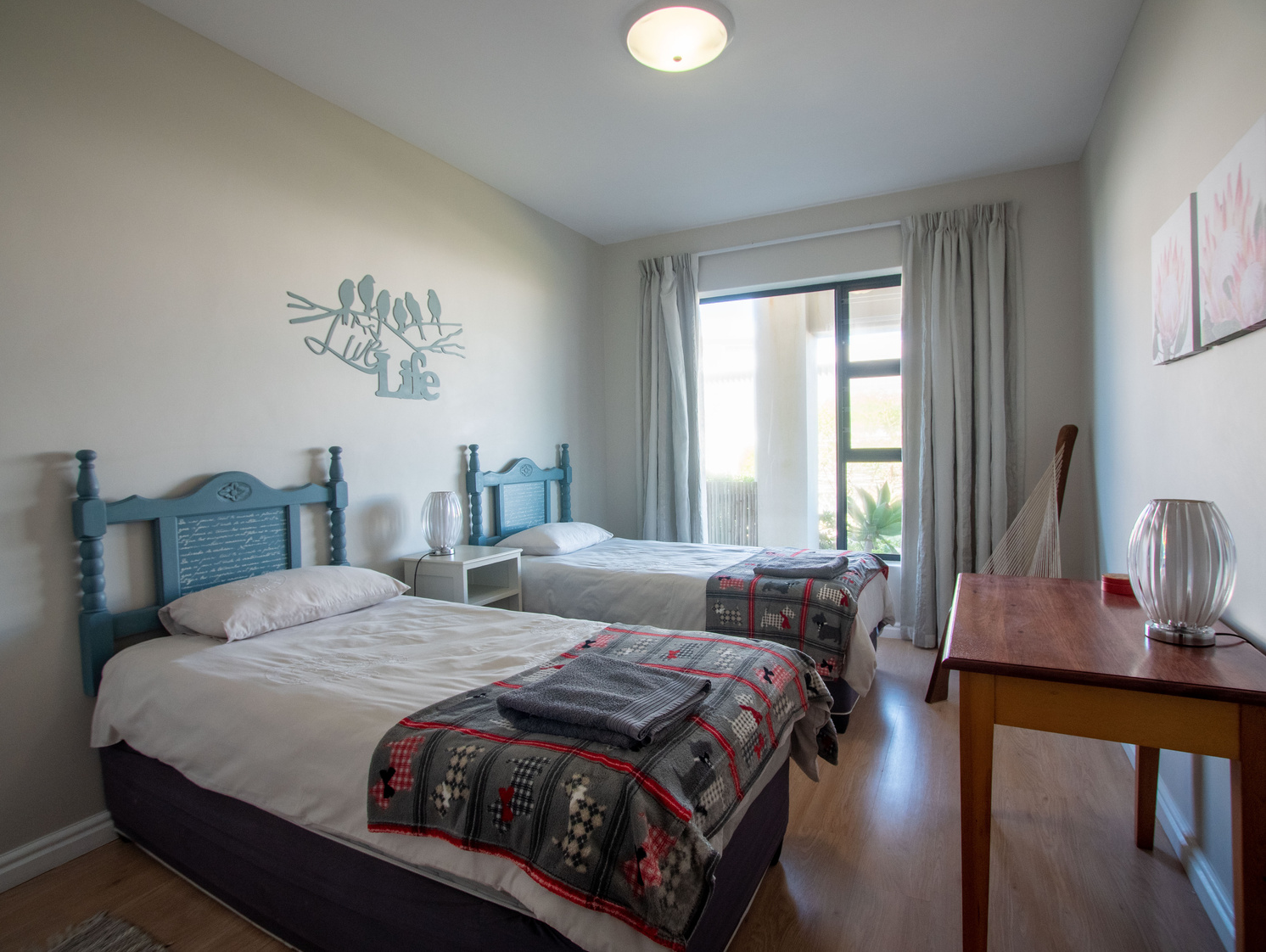 The main bedroom is equipped with a Queen size bed and the second bedroom with 2 single beds which can be changed to a King on request.